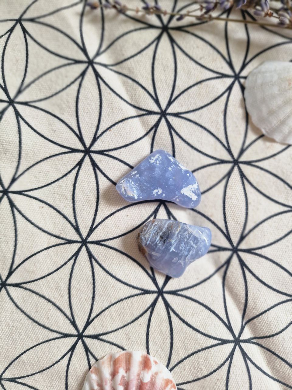 CALCEDONIO: “Pietra che aiuta la comunicazione” Rappresenta entrambi gli aspetti della comunicazione: la capacità di ascoltare e di capire e quella di farsi capire. Adatto a trasformare la malinconia in gioia. Aiuta ad affrontare situazioni stressanti, da cui non si vede via d’uscita. E’ un amuleto scaccia paure. Rafforza la memoria, aiuta negli esami e nei colloqui.