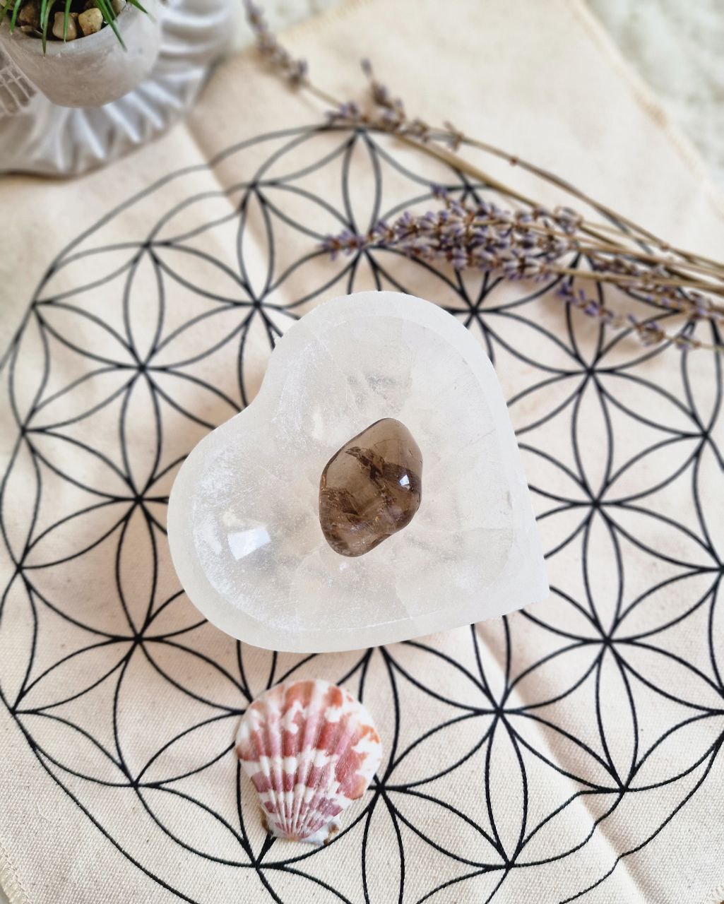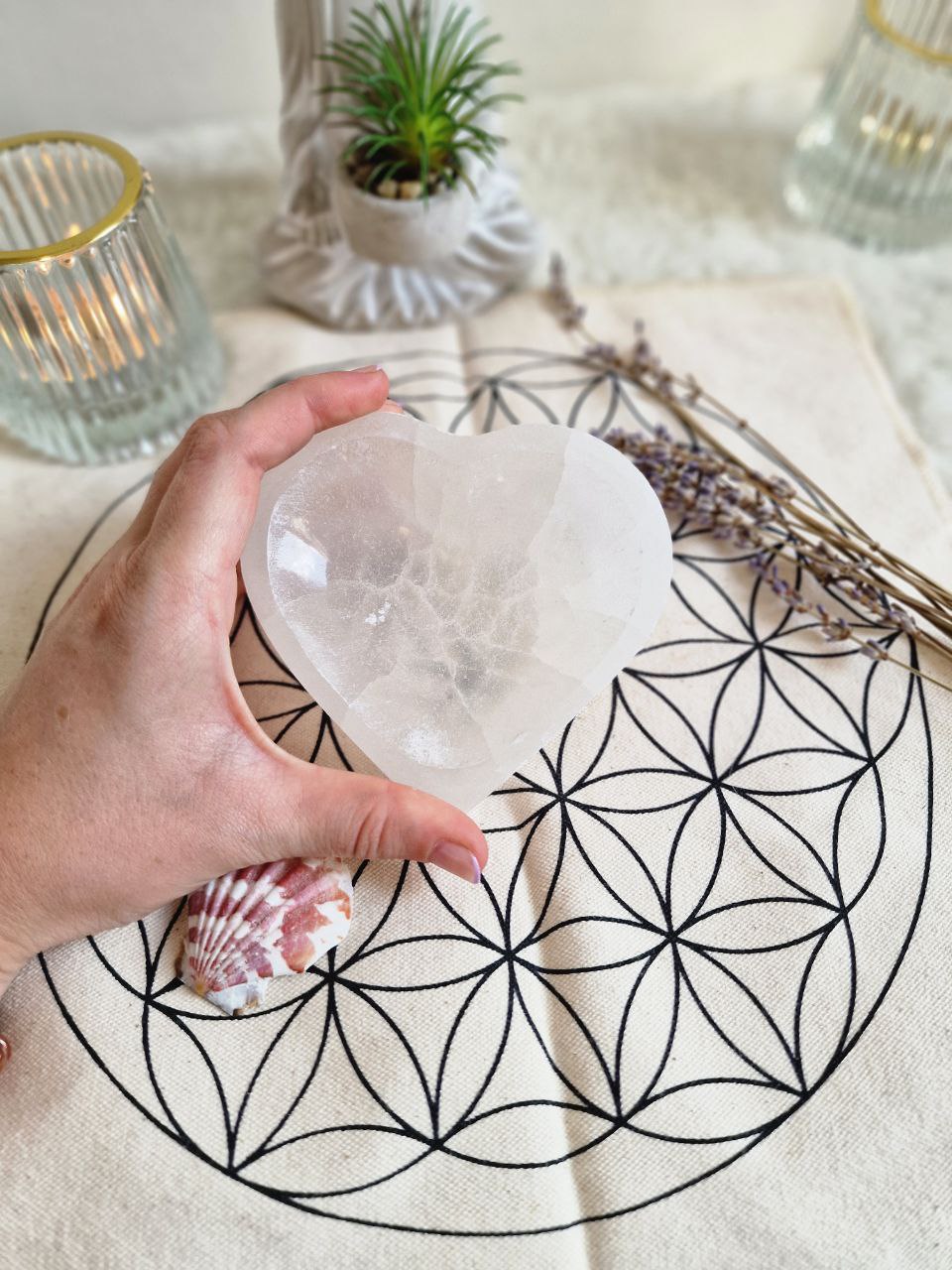 CIOTOLA DI SELENITE A CUORE: unisce il simbolismo profondo del cuore, emblema di amore, compassione ed empatia, con le proprietà elevate della selenite, nota come “pietra della tranquillità”. Questa ciotola, oltre ad essere utilizzata come metodo di ricarica per altre pietre, favorisce chiarezza mentale e un senso di pace interiore, supportando la connessione con i centri energetici superiori durante la meditazione. Ideale per chi desidera rafforzare la propria individualità e migliorare il benessere energetico, è anche apprezzata per i benefici sulla pelle e l’assorbimento del calcio. Un oggetto prezioso per chi cerca equilibrio spirituale ed emotivo.