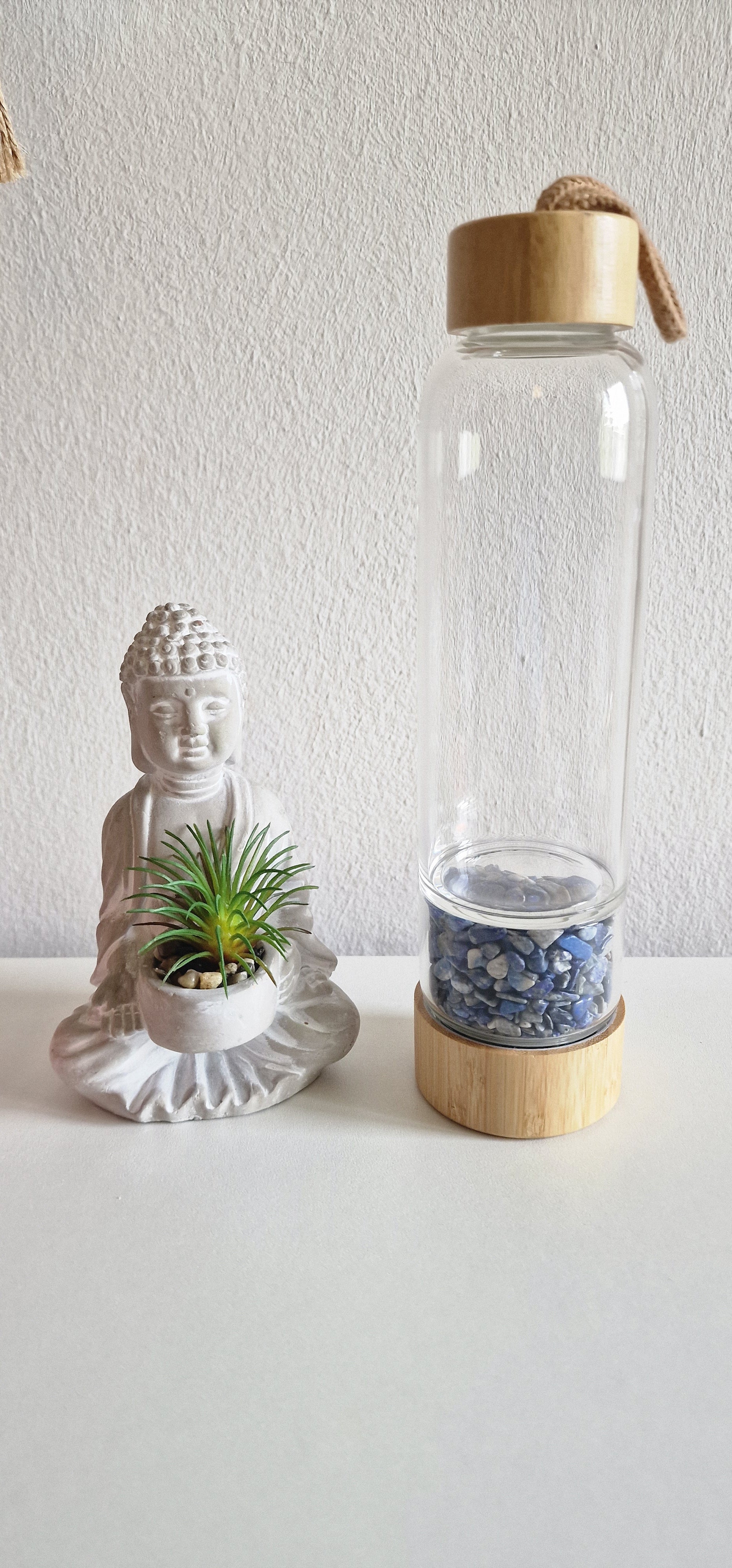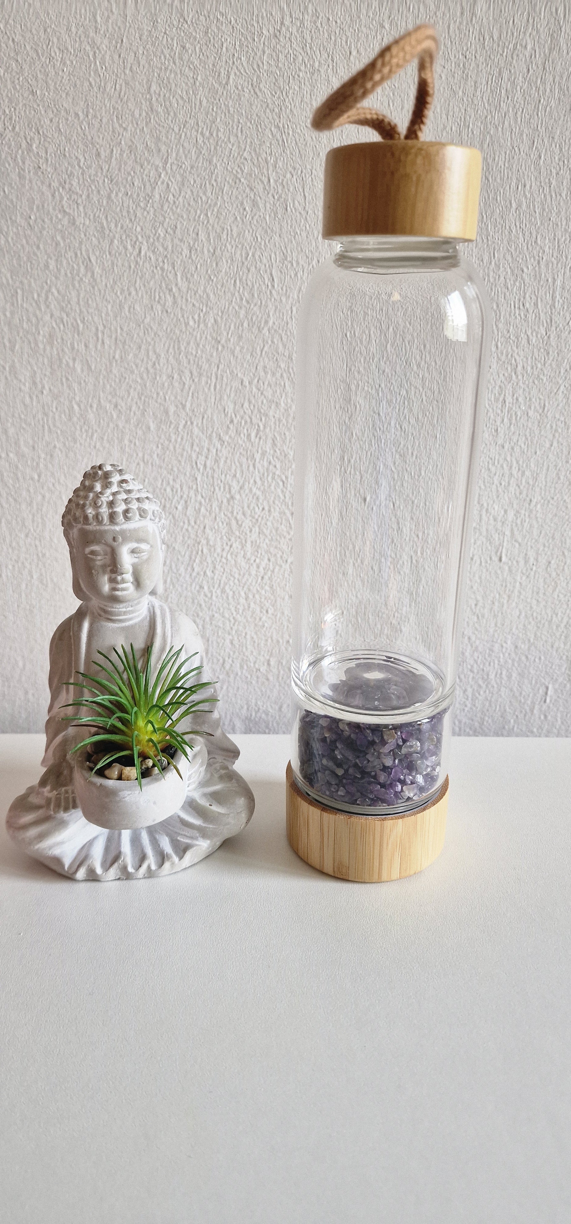 Energy è la bottiglia in vetro con doppio fondo per pietre che aiuta nel creare acqua informata.